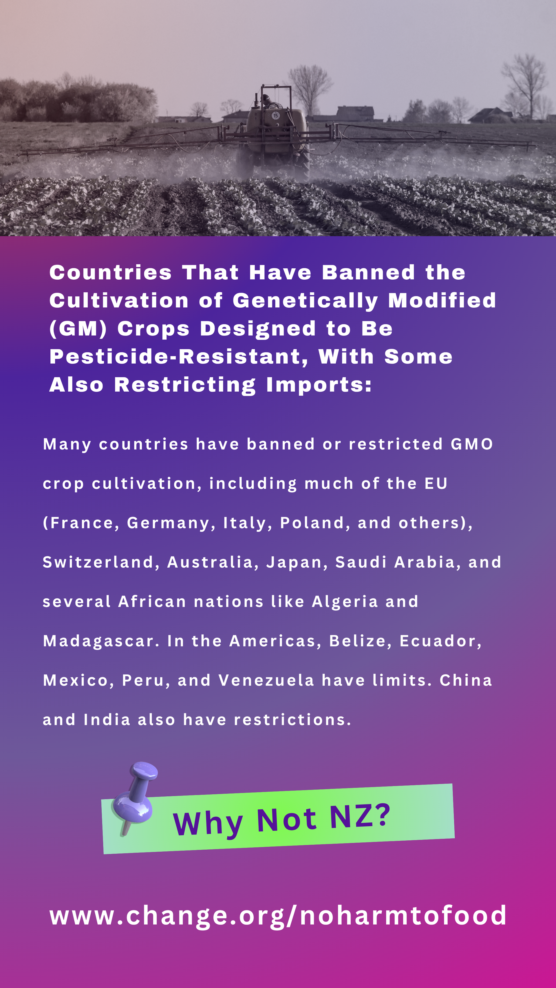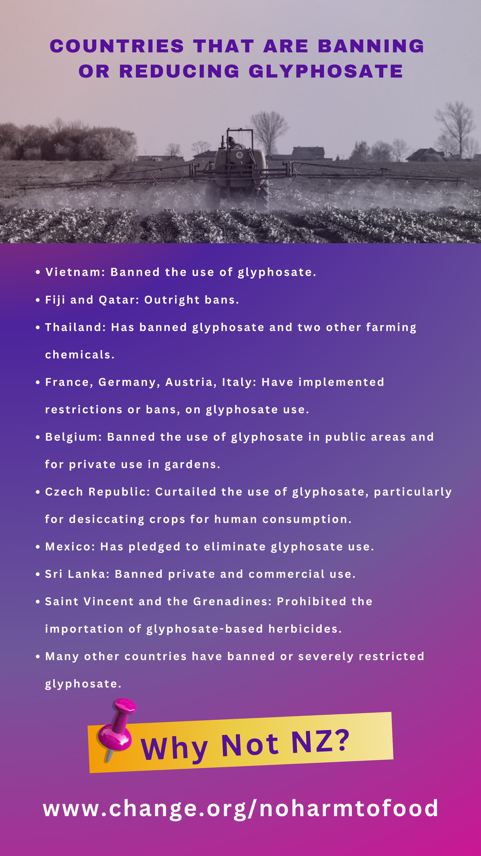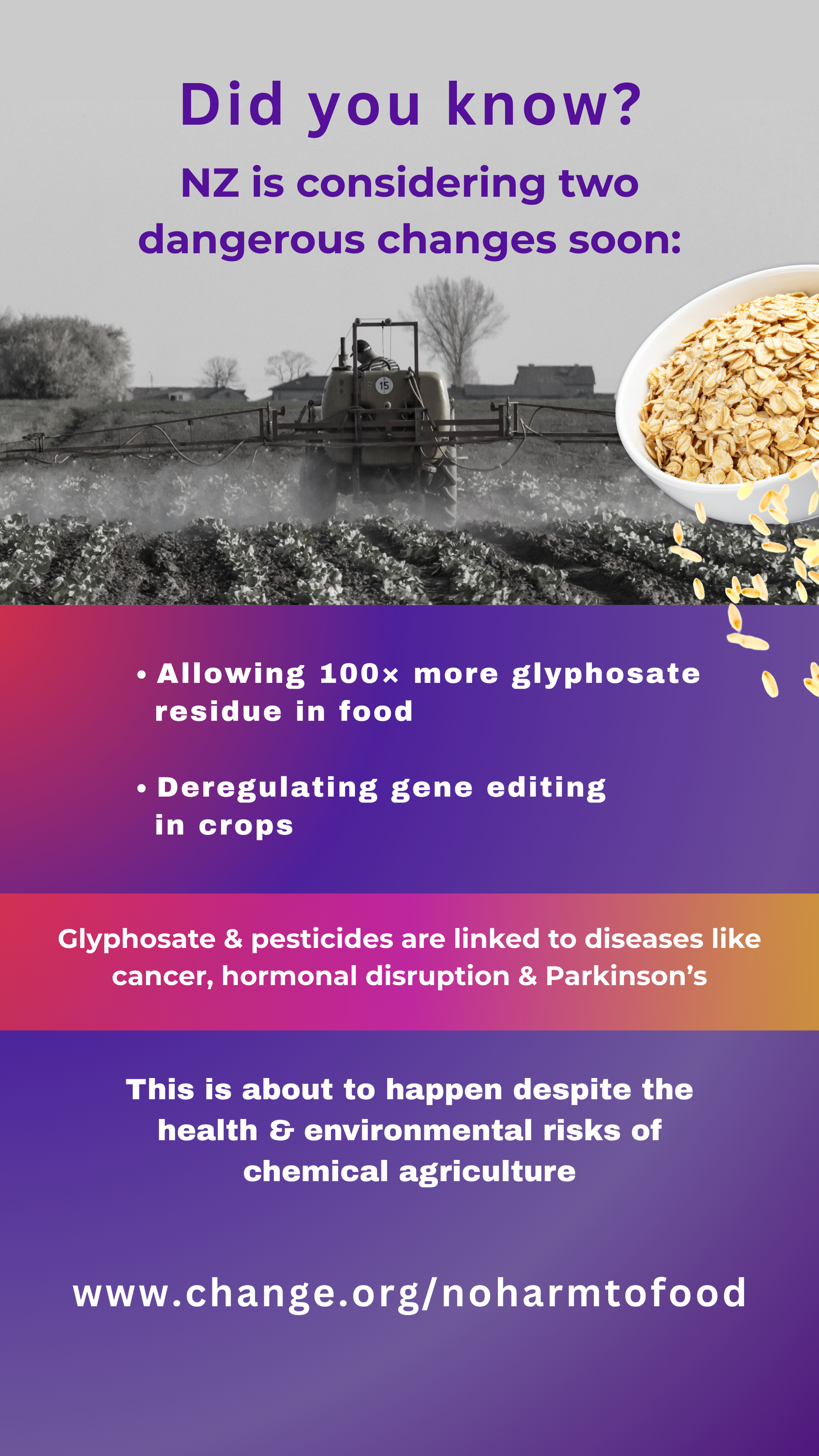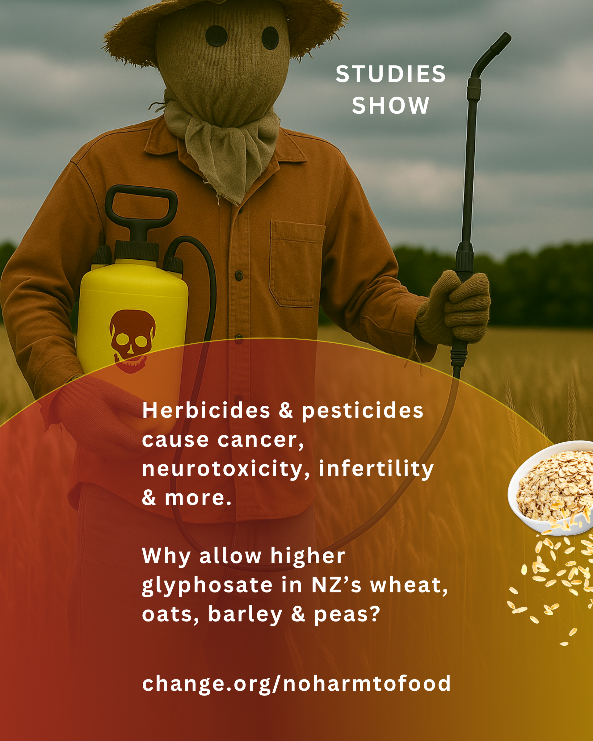 Caring for NZ’s health. Raising awareness about chemicals, food safety, and pesticides through independent, volunteer research that isn’t funded or shaped by chemical companies. Sharing research that shows why The Gene Technology and Glyphosate increase bills are harmful to NZ health, sustainability and the economy.