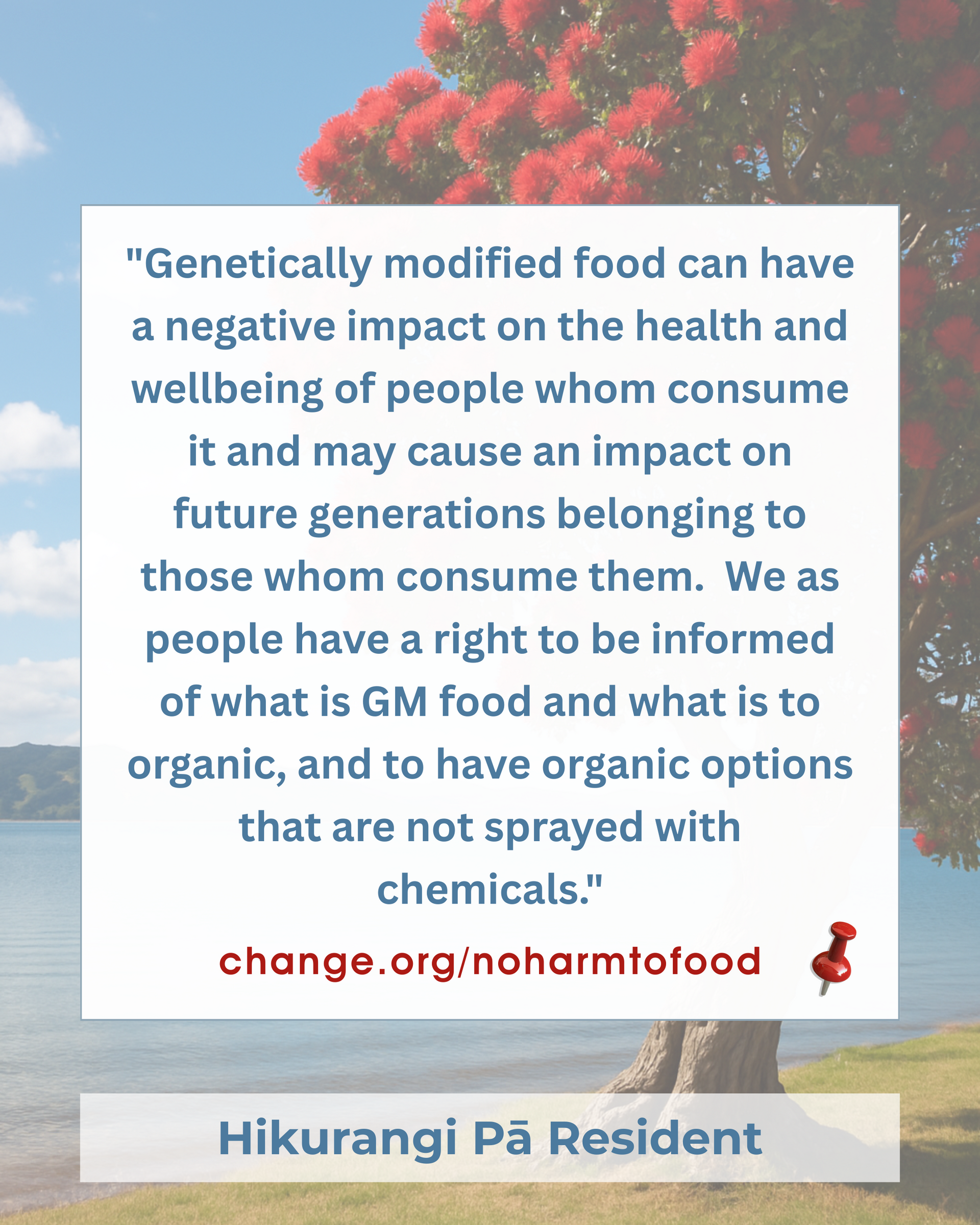 "Genetically modified food can have a negative impact on the health and wellbeing of people whom consume it and may cause an impact on future generations belonging to those whom consume them. We as people have a right to be informed of what is GM food and what is to organic, and to have organic options that are not sprayed with chemicals."